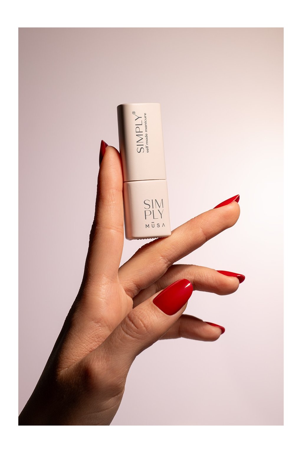 Naneste tenkú vrstvu laku SIMPLY MUSA rovnomernými ťahmi štetca a polymerizujte v lampe. Pre intenzívnejší efekt naneste druhú vrstvu farby a opäť polymerizujte.